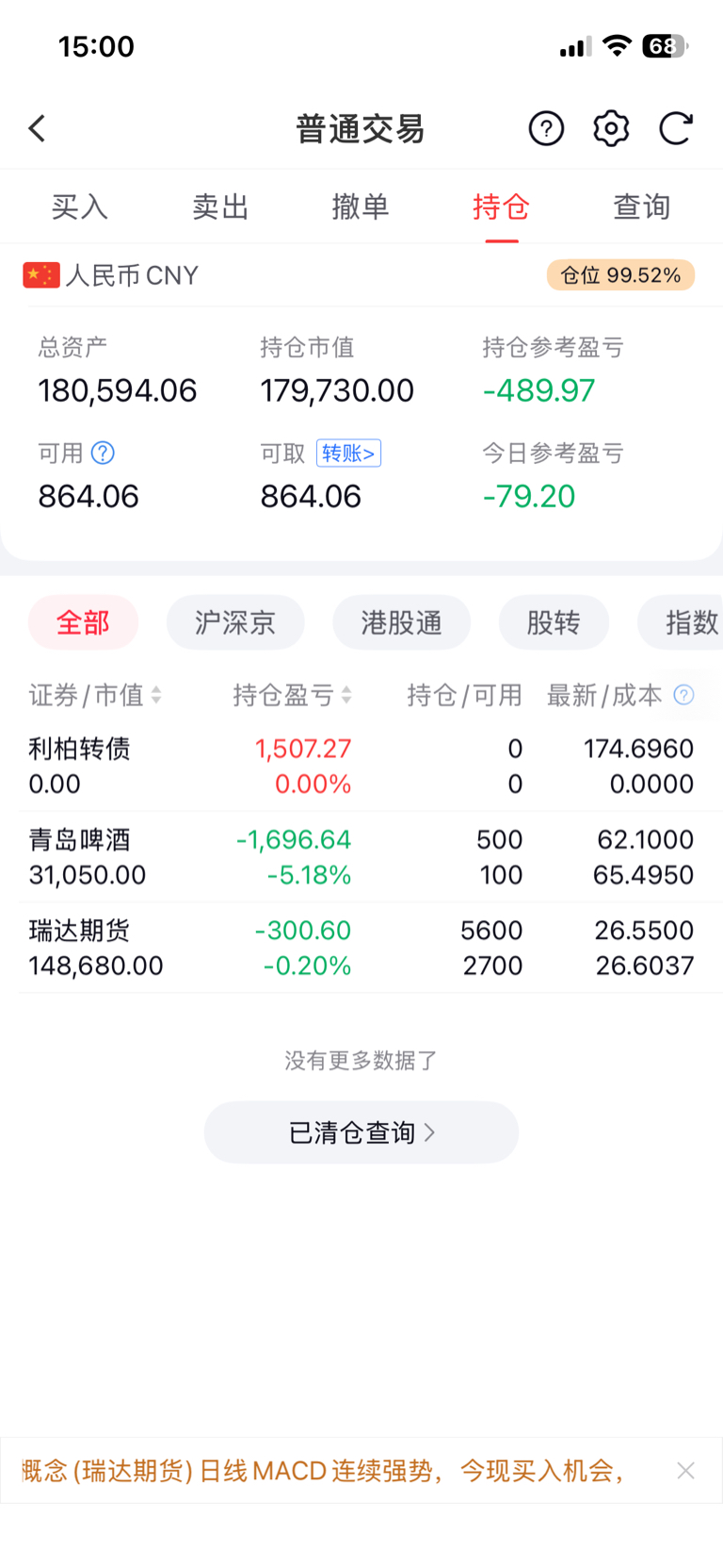 青岛啤酒62.29卖出的,62.10补回400,瑞达上午27.07卖出2400,