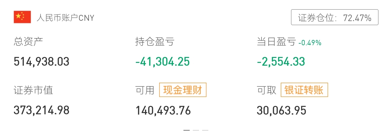 人民币账户证券仓位超七成,持仓亏损明显,可用资金有限,需谨慎操作。