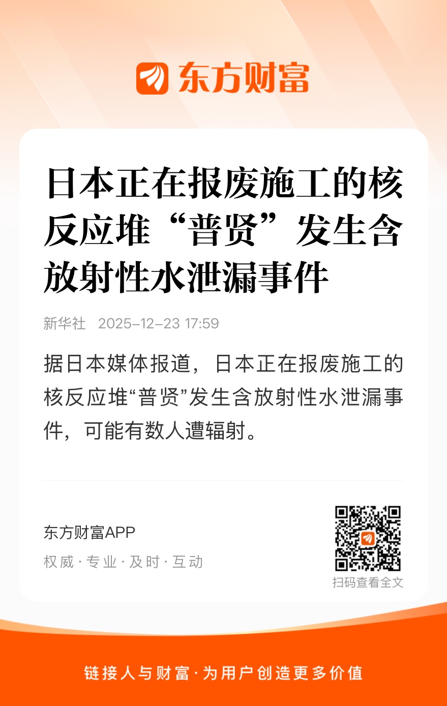 据日本原子能规制委员会消息,今天(12月23日),位于福井县、正在进行废炉作业的新型转换反应堆“普贤”在设施拆除过程中,发生了含有放射性物质氚的水泄漏事件。据规制委员会称,此次泄漏的水量约为20毫升,且水中放射性物质的浓度高。据称目前没有发生作业人员因吸入水等导致的内部辐射暴露情况,但对于是否因水溅到身上等造成外部辐射暴露,相关部门正在调查详细情况。#日本核反应堆泄漏水放射性浓度高##日本一核反应堆泄漏#