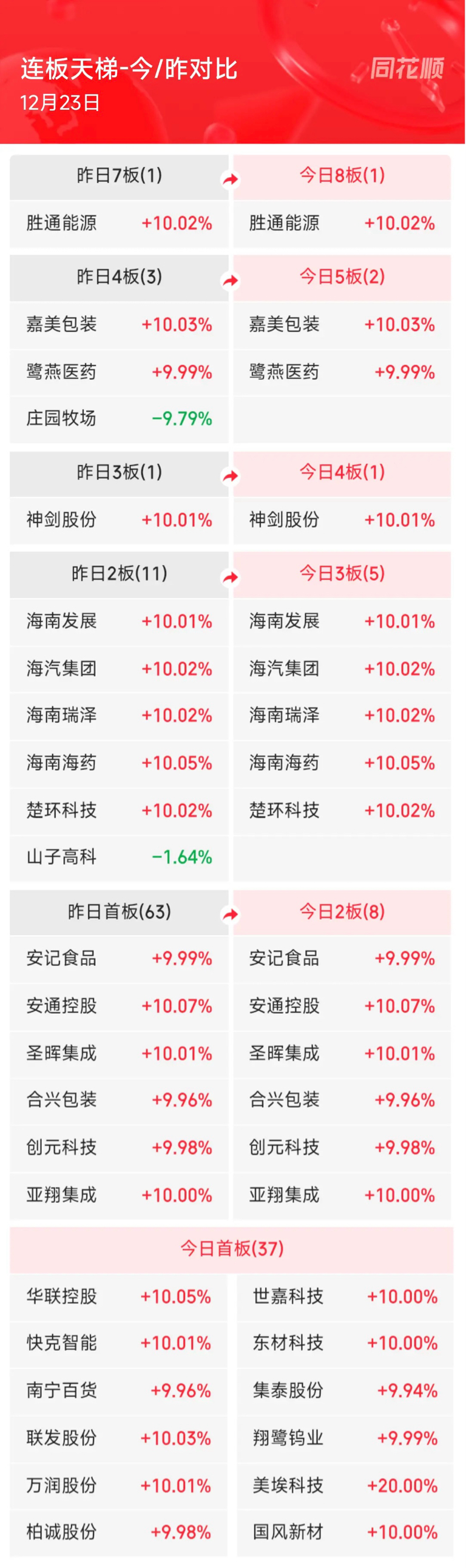 12月23日,今日涨停复盘(涨停54个),包括半导体等板块,市场情绪不佳。1、八连板:胜通能源2、五连板:嘉美包装、鹭燕医药3、四连板:神剑股份4、三连板:海南发展、海汽集团、海南瑞泽、海南海药、楚环科技5、二连板:安记食品、安通控股、合兴包装、亚翔集成、圣晖集成、创元科技等6、首板:国风新材、东材科技、华联控股、世嘉科技等#社区牛人计划#