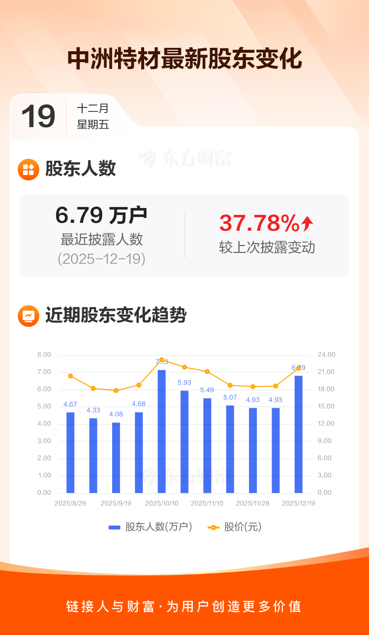 中洲特材最新披露数据显示,截至12月19日公司股东户数为6.79万户,较上期(2025年12月10日)增加1.86万户,增幅为37.78%。户均持有流通股数量由上期的5873股下降至4263股,户均持股金额由上期的10.93万元减少至9.24万元。