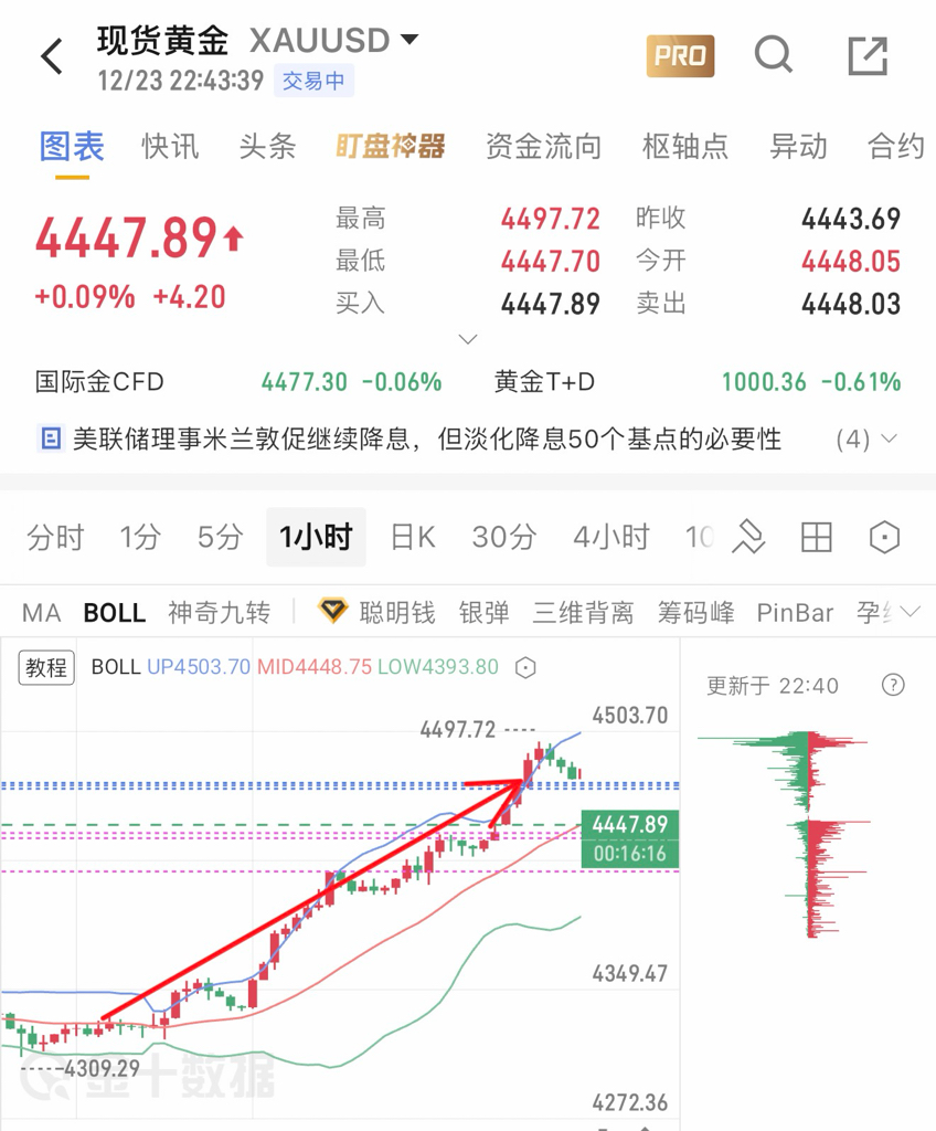 黄金在上周五就开始长线布局多单,自4315下方一直坚定看涨,最高目标位给到4450、行情最高来到4490一线,走出了175个点利润空间;