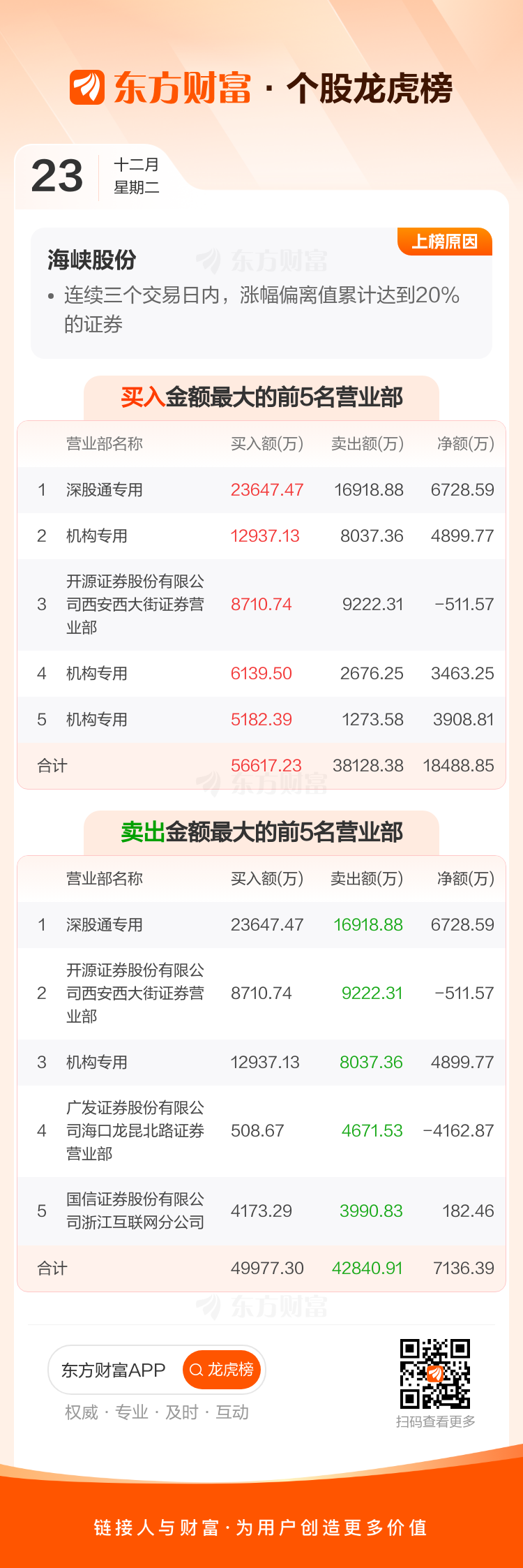 交易所2025年12月23日公布的交易公开信息显示,海峡股份因成为连续三个交易日内,涨幅偏离值累计达到20%的证券上榜。海峡股份当日收报13.43元,涨跌幅6.42%,换手率9.50%,成交额28.70亿。异常期间12月19日至12月23日,期间涨幅27.06%,累计偏离值24.96%,区间成交额49.23亿。