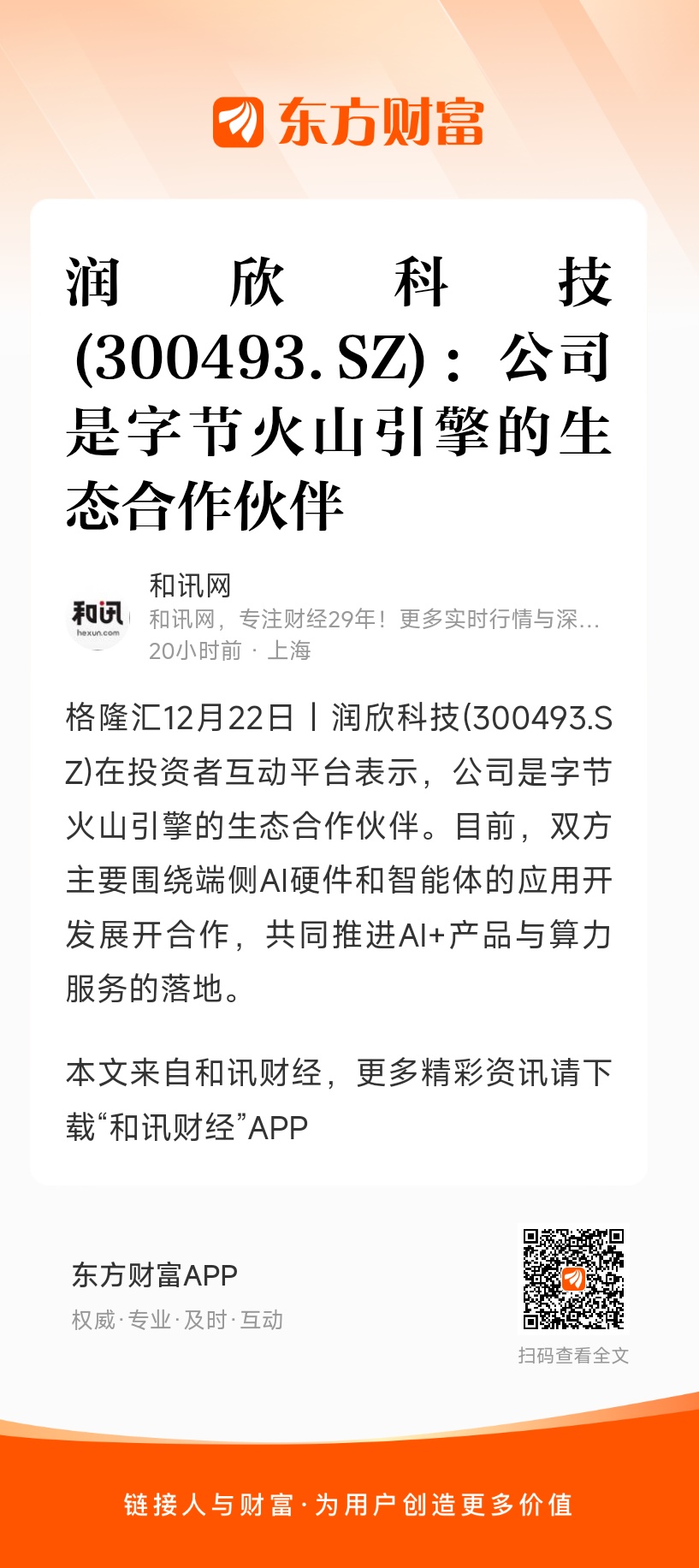 格隆汇12月22日丨润欣科技(300493.SZ)在投资者互动平台表示,公司是字节火山引擎的生态合作伙伴。目前,双方主要围绕端侧AI硬件和智能体的应用开发展开合作,共同推进AI+产品与算力服务的落地。