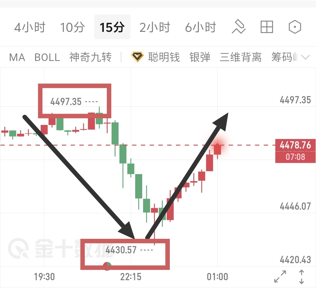 亚欧盘黄金震荡走弱,波幅持续收窄,美盘时段趋势反转,价格跳水走出瀑布式下跌行情,到支撑位4430附近反弹
