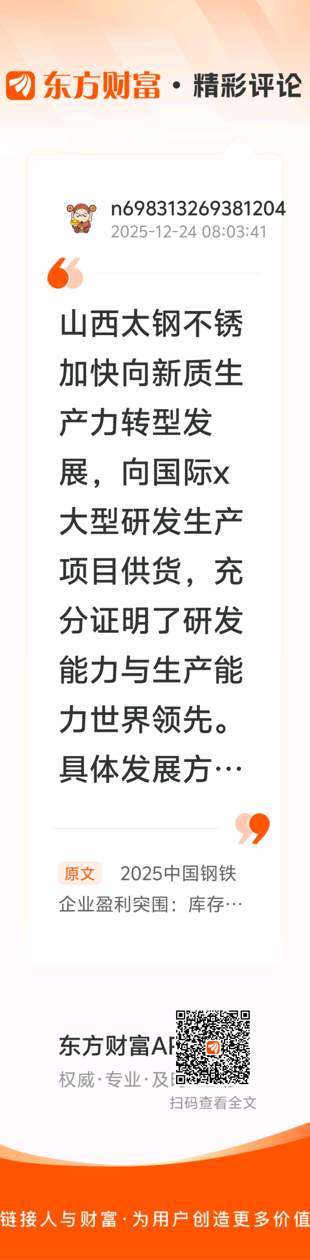 当前,太钢不锈在高端产品领域的持续突破,其独有领先产品、高盈利产品和战略产品销量占比已超过60%;旗下“手撕钢”产品高温超导基材用精密箔材和掩膜版用精密箔材首发,实现了此类材料的国产化;全球首发海上光伏支架用不锈钢;攻克不锈钢特厚板机械性能控制难题,完成向某国际重大能源项目的特厚板批量交付。