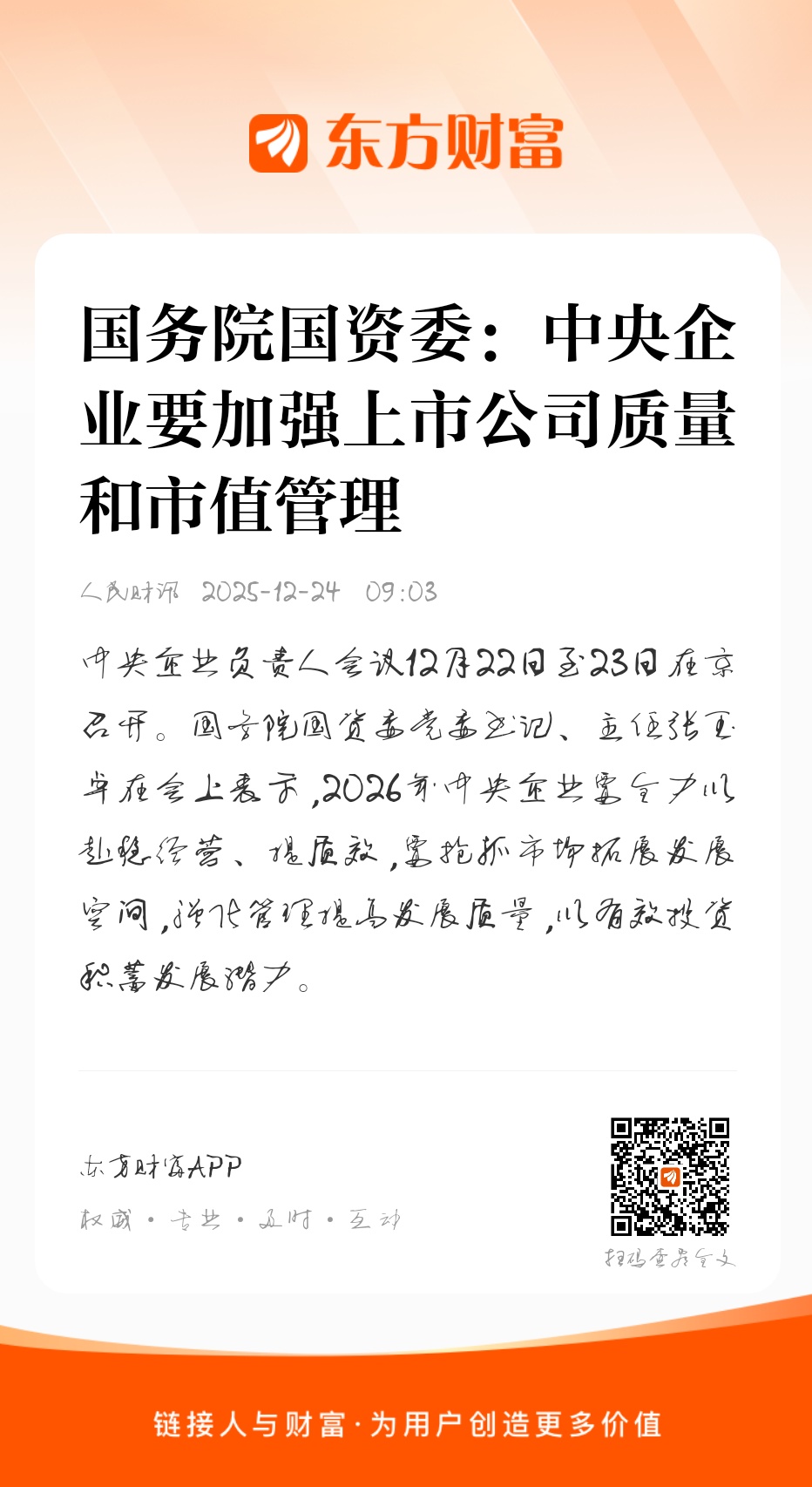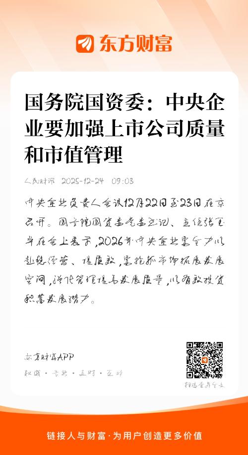 中央企业负责人会议12月22日至23日在京召开。国务院国资委党委书记、主任张玉卓在会上表示,2026年中央企业要全力以赴稳经营、提质效,要抢抓市场拓展发展空间,强化管理提高发展质量,以有效投资积蓄发展潜力。