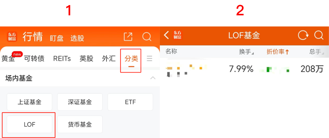 可以在“东方财富APP-行情-分类-LOF”中查看所有LOF的折价率(溢价率的相反数)。需要注意的是,盘中LOF的净值是前日数据,并不实时更新,因此溢价率只能作为参考,和此时的真实溢价率可能有误差。只有更新完当日净值后的溢价率才是准确的值。点此查看LOF溢价率>