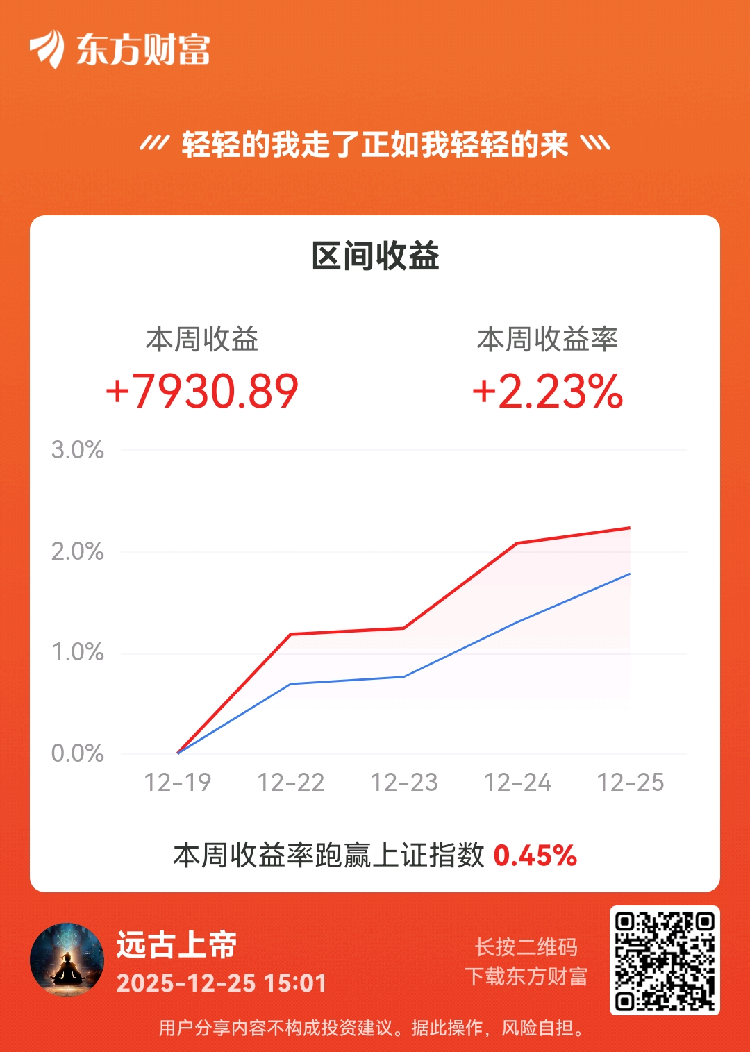 本周运气好连红四天,四天红2.23个点,已经空仓等下周了。