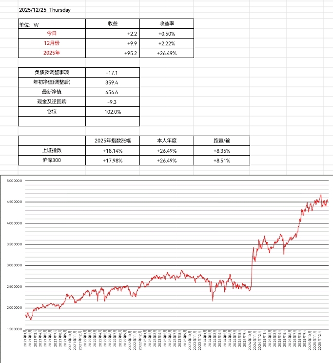 2025.12.25周四今天:+2.2w(+0.5%)2025年:+95.2w(
