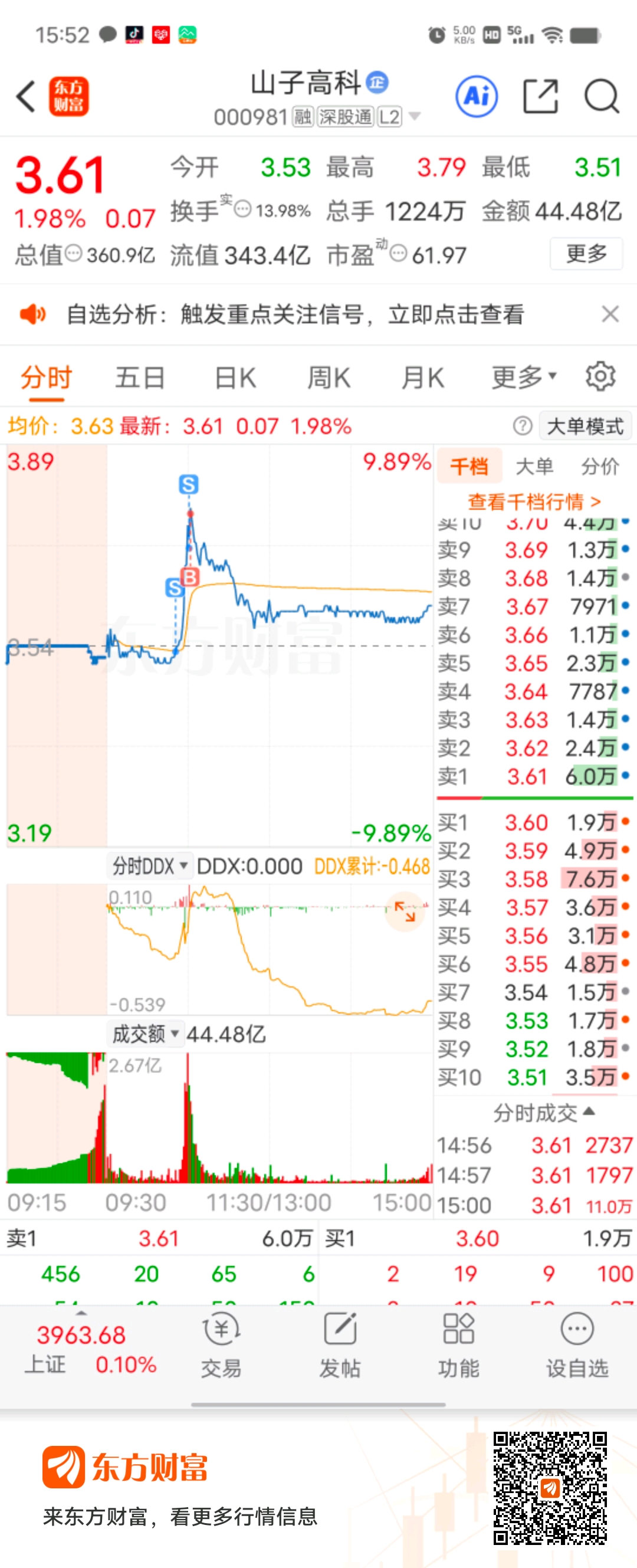 加仓点成卖出,一股不服的精神,又在最高点又买回来,看来山子非得让我吃口肉才行,兄弟们买卖要看清!