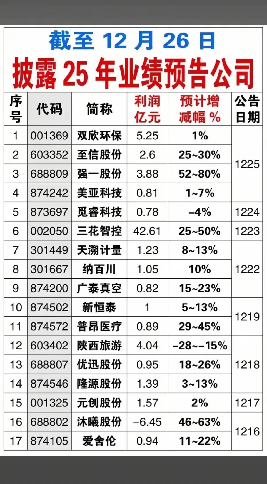 下周关注,点赞收藏。下面梳理了25年业绩预告公司可以作为参考!声明:不构成投资建