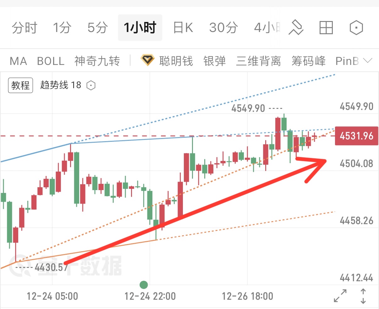 12.23明确支撑4450、目标4500-4520,12.24确认4520突破后看4550,截至12.26黄金最高触及4549.90,1小时级别沿上升趋势线运行的节奏,和预判丝毫不差。#复盘记录#