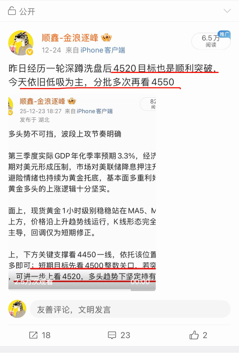 黄金多头走势全程预判兑现!12.23明确支撑4450、目标4500-4520,1