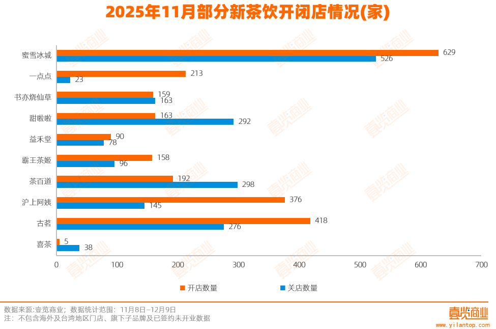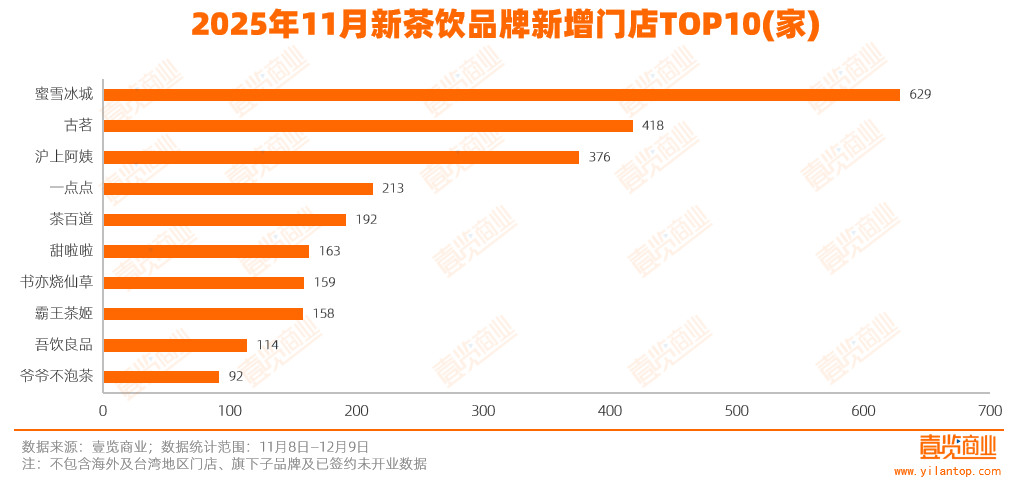 2025年11月,壹览商业监测的30个连锁茶饮品牌合计现有门店总量13.44万家,单月新开3190家、关闭2692家,净增长498家。