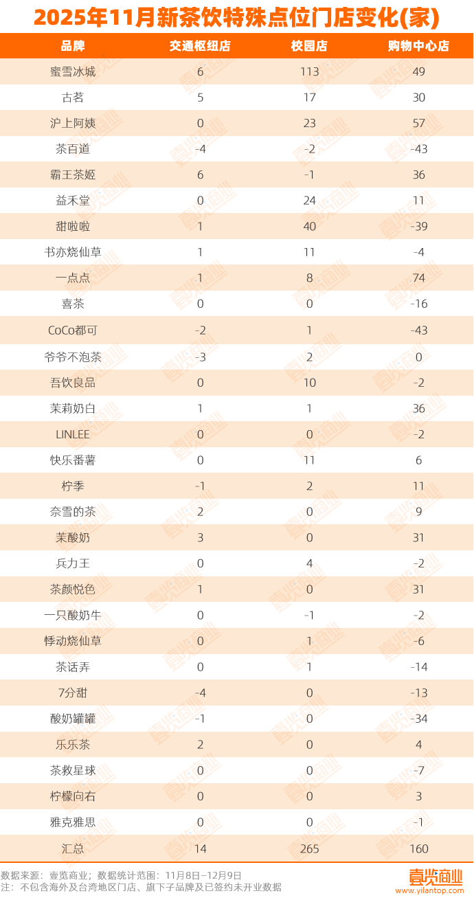 购物中心点位净增160家门店,一点点以净增74家门店位居该渠道首位,不过,当月也有一半的品牌从购物中心撤出部分门店,五分之一的品牌撤出超过10家门店。交通枢纽净增14家,在特殊点位中仅占比4%,品牌们对此处开店较为谨慎,仅11个品牌实现正增长。$古茗(HK|01364)$$蜜雪集团(HK|02097)$$茶百道(HK|02555)$