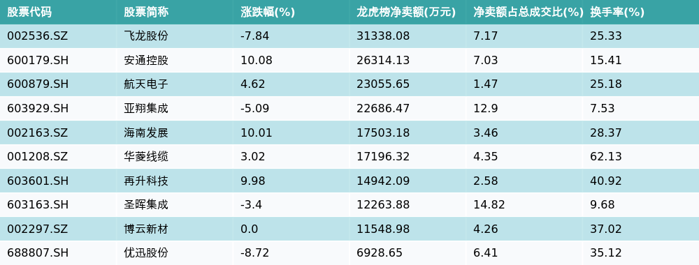 南财智讯12月26日电,南财金融终端数据显示,因当日异动登上龙虎榜的个股中,龙虎榜中资金净流出最多的前三位分别是飞龙股份(002536.SZ)、安通控股(600179.SH)与航天电子(600879.SH)。其中排名第一的飞龙股份被净卖出3.13亿元,占总成交金额的7.17%。飞龙股份收盘下跌7.84%,换手率为25.33%。净卖出额前10个股详情见下图: