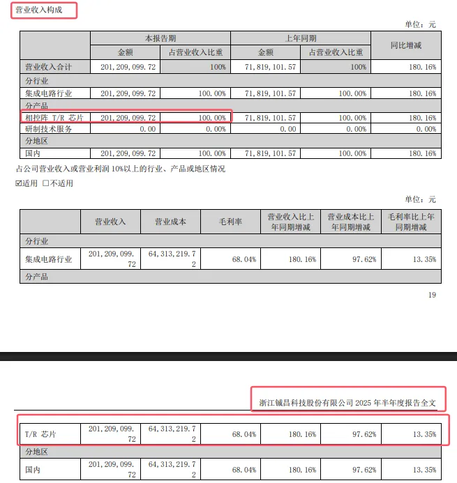 从上图可以看出,铖昌科技的营业收入构成【2025年半年报】100%是相控阵T/R芯片。