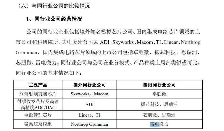 铖昌科技的行业竞争格局及主要企业【铖昌科技招股说明书】: