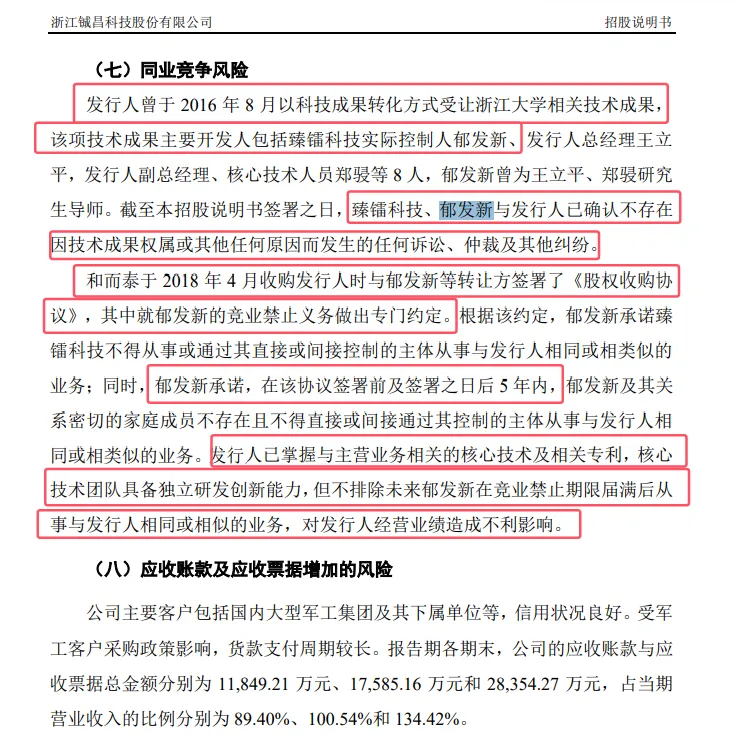 从上图可以知道,和而泰于 2018 年 4 月收购发行人时与郁发新等转让方签署了《股权收购协议》,其中就郁发新的竞业禁止义务做出专门约定。根据该约定,郁发新承诺臻镭科技不得从事或通过其直接或间接控制的主体从事与发行人相同或相类似的业务;同时,郁发新承诺,在该协议签署前及签署之日后 5 年内,郁发新及其关系密切的家庭成员不存在且不得直接或间接通过其控制的主体从事与发行人相同或相类似的业务。发行人已掌握与主营业务相关的核心技术及相关专利,核心技术团队具备独立研发创新能力,但不排除未来郁发新在竞业禁止期限届满后从事与发行人相同或相似的业务,对发行人经营业绩造成不利影响。