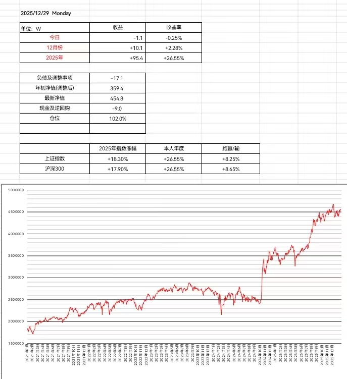 2025.12.29周一今日-1.1w(-0.25%)2025年+95.4w(+