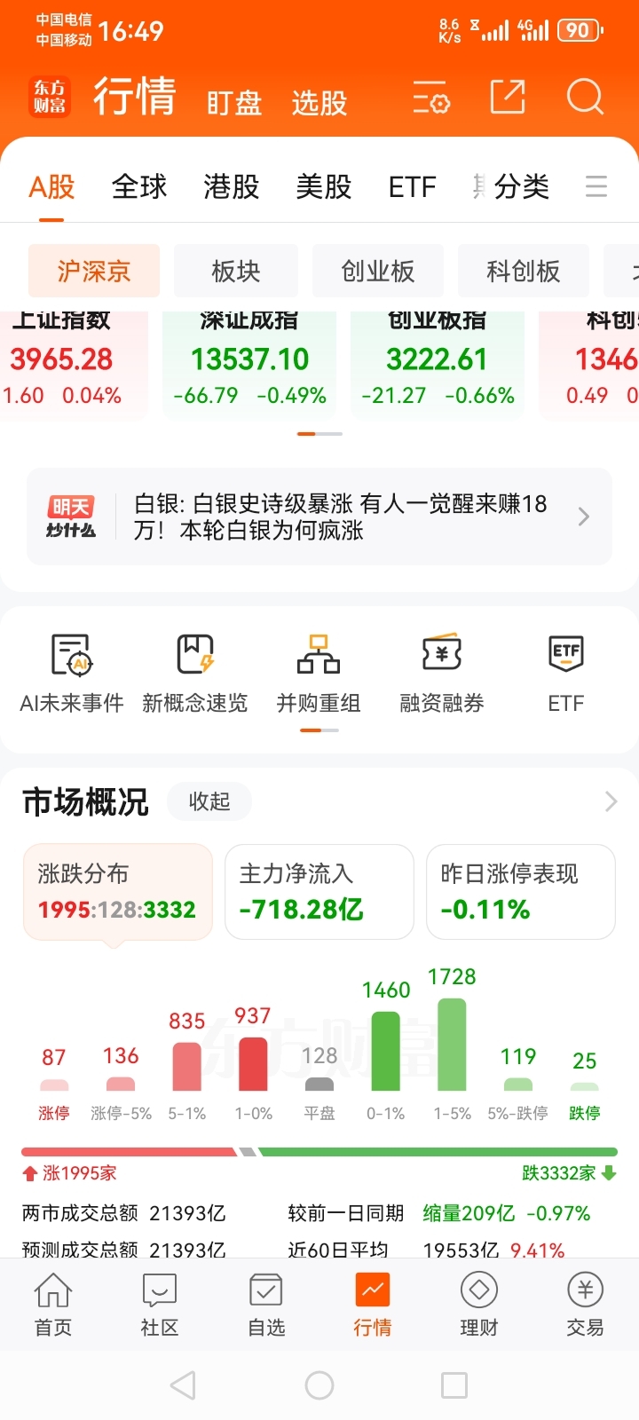 【今日收评】三大指数涨跌不一,沪指微涨走出九连阳。截至收盘,上证指数涨0.04%,报3965.28,深成指跌0.49%,报13537.10点,创业板指跌0.66%,报3222.61点。沪深两市成交额2.14万亿,较上一个交易日缩量209亿。