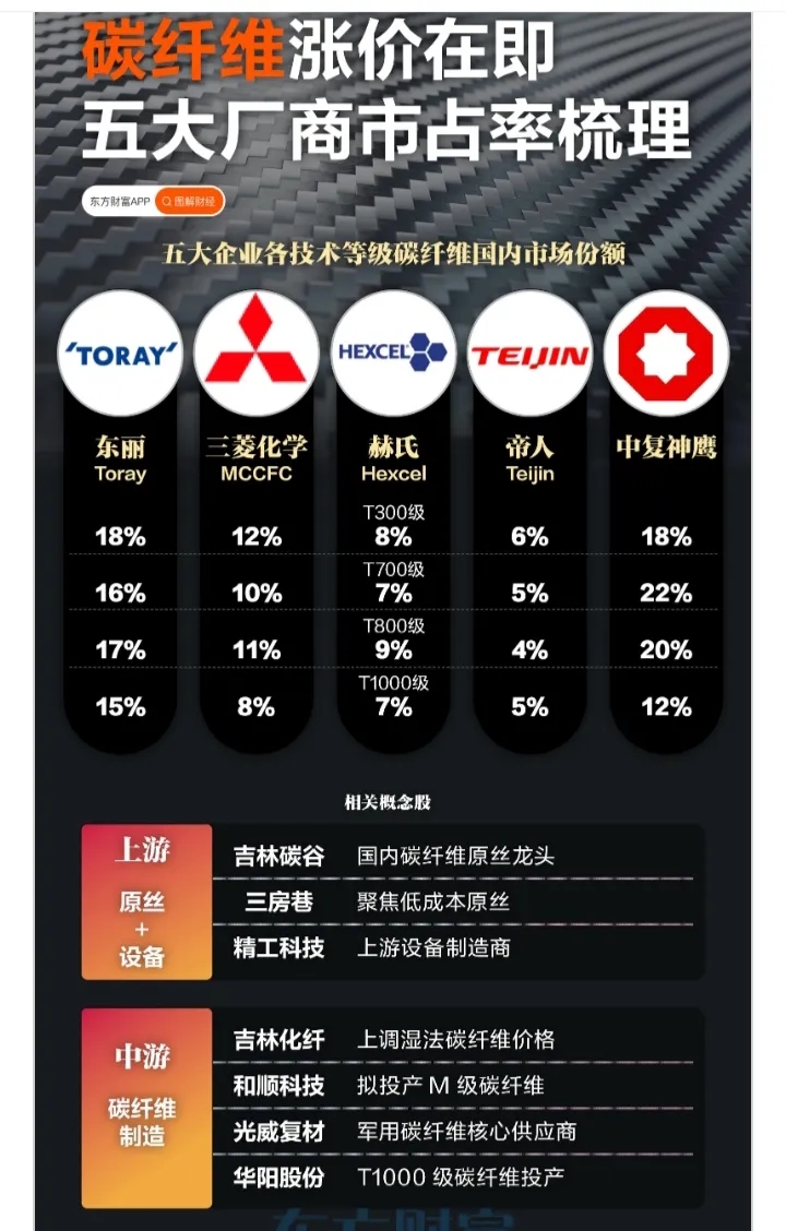 碳纤维五大厂商市占率及相关概念股票梳理: