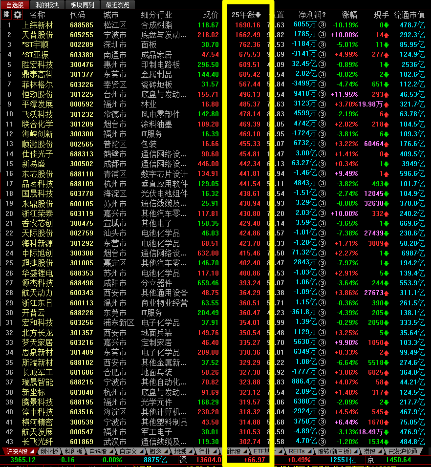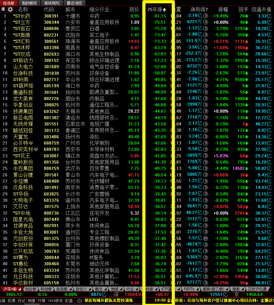 2025年全年沪深2市 个股涨跌排行榜:综合起来全年跌幅最巨大的就是空壳的垃圾股,这是血一般的教训,也是那些喜欢买垃圾股的人应得的结局,其它个股即便全年持有不动损失也不是巨大,之所以有那么多人全年严重亏损,除了不会选波段,就是频繁的去追高杀跌导致的