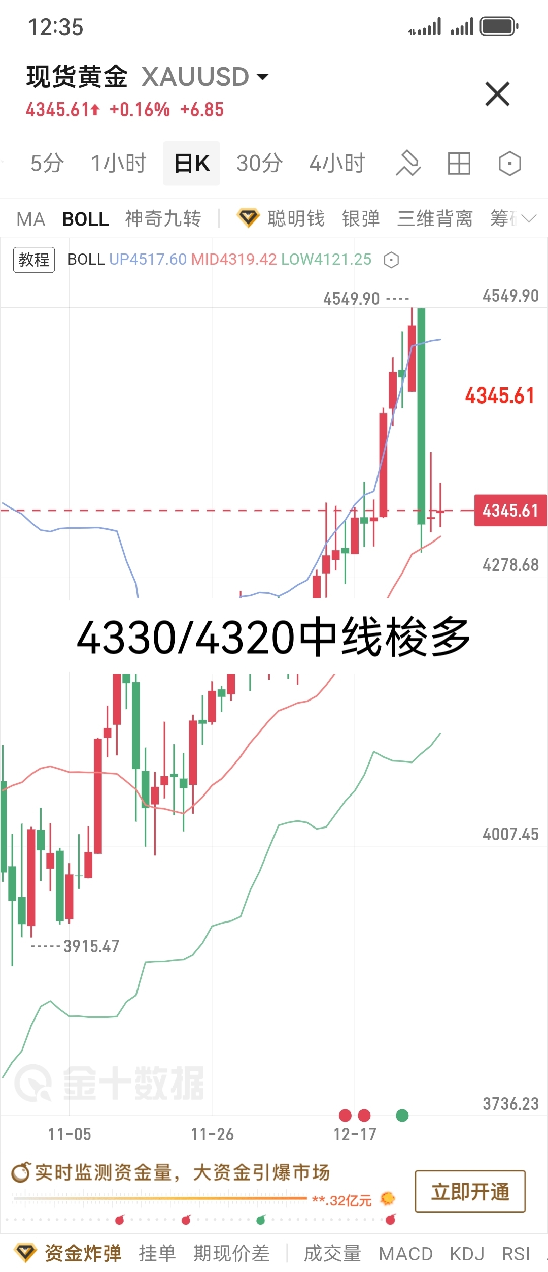 黄金,继前一日大阴回撤后昨在日线中轨暂缓脚步,日线收十字星下行结构暂缓,短期支撑4320尤为关键,大方向依然是强势牛周期,这波回撤修正也是情理之中,接下来需要关注的就是技术面意外的事情,大概率是时间换空间的走法,下方只要守住4320-4300这个区域,下一步依然会再次向上冲高。 中期还是围绕这个区域去布橘多单,日内短线先卡4335-4365跑短线。#黄金投资讨论区#