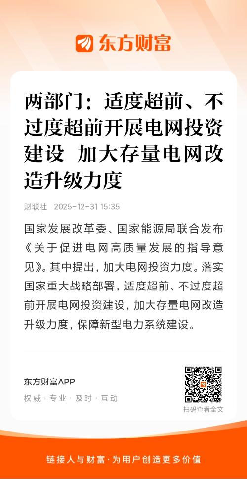 国家发展改革委、国家能源局联合发布《关于促进电网高质量发展的指导意见》。其中提出,加大电网投资力度。落实国家重大战略部署,适度超前、不过度超前开展电网投资建设,加大存量电网改造升级力度,保障新型电力系统建设。鼓励符合条件的民间资本参与电网投资建设。优化电网企业投资经营考核管理机制。