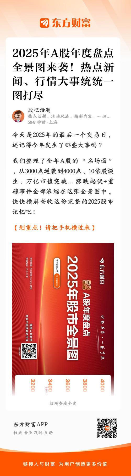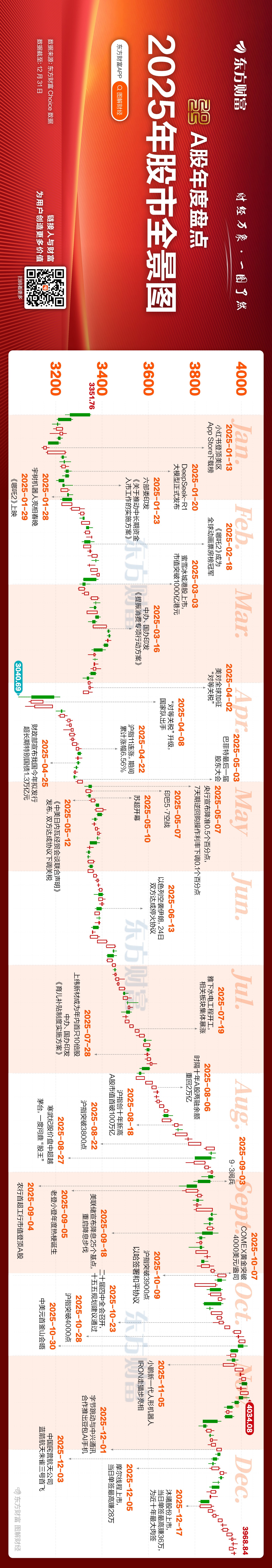 我们整理了全年A股的 “名场面” ,从3000点逆袭到4000点、10倍股诞生、万亿市值突破… 涨跌起伏+重磅事件全部浓缩在这张全景图中。快快横屏查收这份完整的2025股市记忆吧!