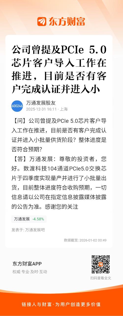 公司曾提及PCIe 5.0芯片客户导入工作在推进,目前是否有客户完成认证并进入小批量供货阶段?整体进度是否符合预期?