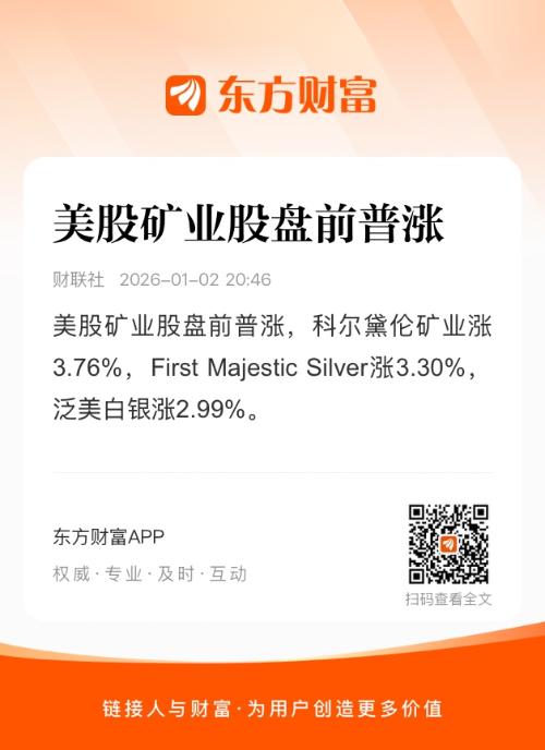 美股矿业股盘前普涨,科尔黛伦矿业涨3.76%,First Majestic Silver涨3.30%,泛美白银涨2.99%,Silvercorp Metal持平,金罗斯黄金涨2.31%,埃氏金业涨2.56%,赫克拉矿业涨3.02%,哈莫尼黄金涨2.06%,Gold.com涨1.56%,金田涨1.44%,纽曼矿业涨2.14%。