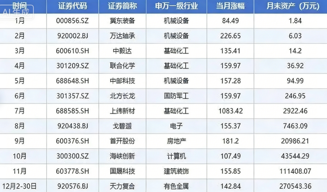 2025年A股市场结构性行情贯穿全年,热点轮动脉络清晰,呈现出“你方唱罢我登场”的局面。从年初的人形机器人、AI浪潮,到化工、可控核聚变、固态电池等概念接力领跑,再到年末的商业航天,题材炒作此起彼伏。单月涨幅领先个股普遍实现翻倍,其中7月上纬新材(688585.SH)表现尤为亮眼,当月累计涨幅达到1083%,创下年度单月涨幅纪录。
