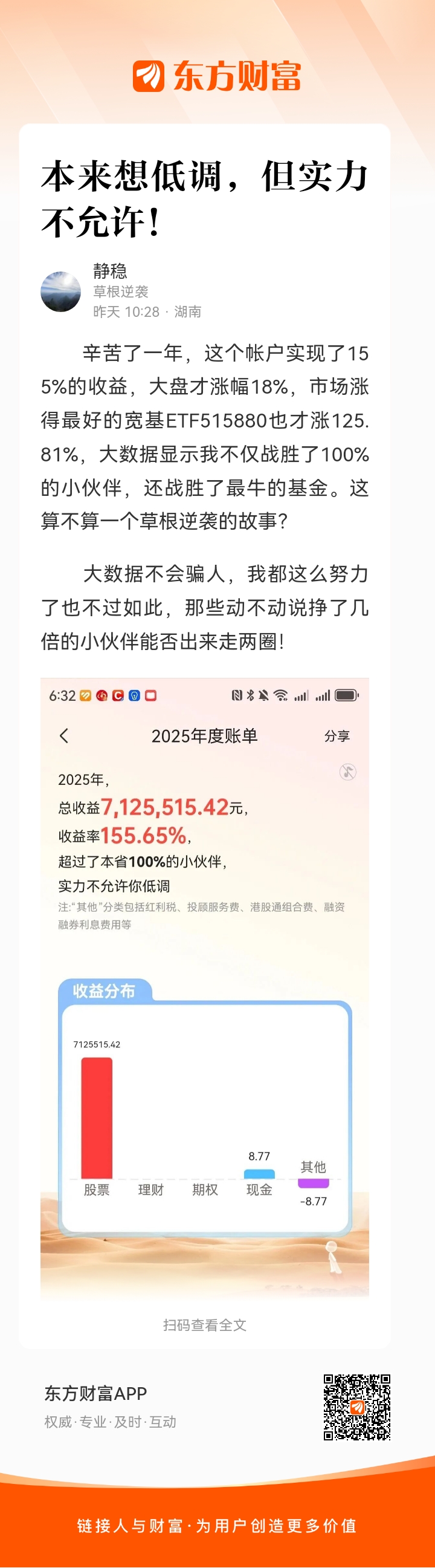 辛苦了一年,这个帐户实现了155%的收益,大盘才涨幅18%,市场涨得最好的宽基ETF515880也才涨125.81%,大数据显示我不仅战胜了100%的小伙伴,还战胜了最牛的基金。这算不算一个草根逆袭的故事?