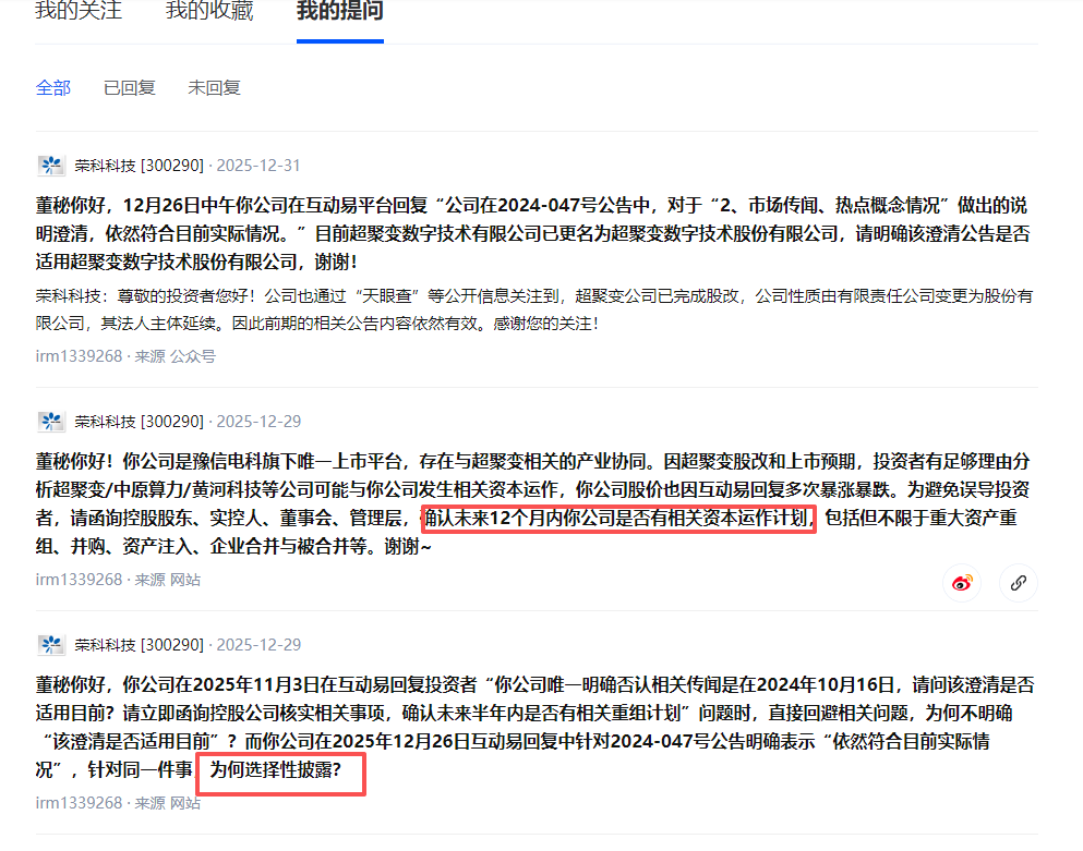 因$荣科科技(SZ300290)$董秘喜欢高频回复问题,且在收盘时间之前,尤其喜欢回复对打压股价有利的问题。