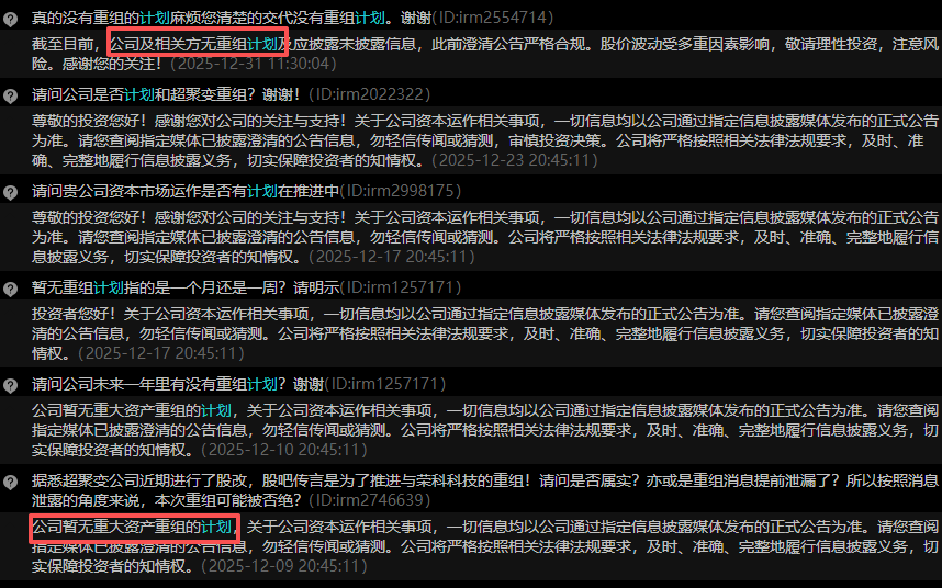 搞了那么多,接下来步入主题,既然董秘不能在互动易承认重组“计划”,那么我们反过来,能不能让董秘主动否认重组可能呢?