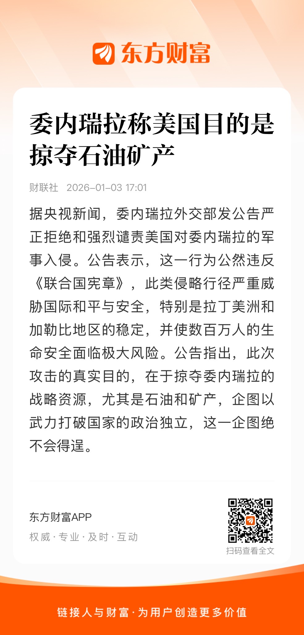 据央视新闻,委内瑞拉外交部发公告严正拒绝和强烈谴责美国对委内瑞拉的军事入侵。公告表示,这一行为公然违反《联合国宪章》,此类侵略行径严重威胁国际和平与安全,特别是拉丁美洲和加勒比地区的稳定,并使数百万人的生命安全面临极大风险。公告指出,此次攻击的真实目的,在于掠夺委内瑞拉的战略资源,尤其是石油和矿产,企图以武力打破国家的政治独立,这一企图绝不会得逞。