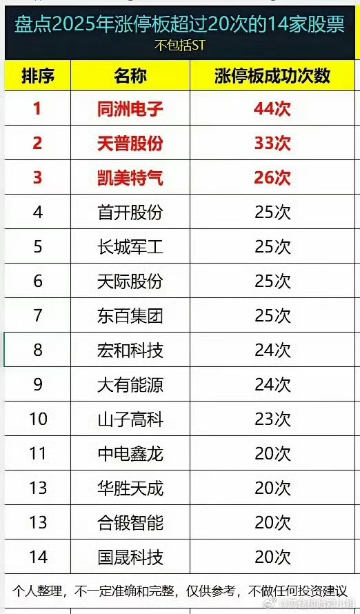 盘点2025年那些涨停板超过20次的14家股票!1、同洲电子:涨停板44次2、天