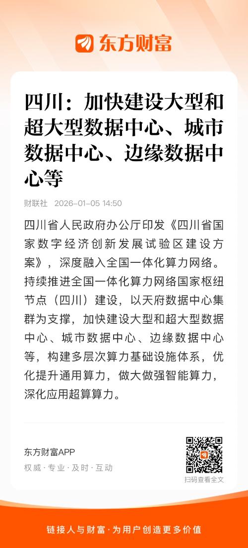 四川省人民政府办公厅印发《四川省国家数字经济创新发展试验区建设方案》,深度融入全国一体化算力网络。持续推进全国一体化算力网络国家枢纽节点(四川)建设,以天府数据中心集群为支撑,加快建设大型和超大型数据中心、城市数据中心、边缘数据中心等,构建多层次算力基础设施体系,优化提升通用算力,做大做强智能算力,深化应用超算算力。推动国家新型互联网交换中心建设,积极参与全国一体化算力网原型技术实验场建设。