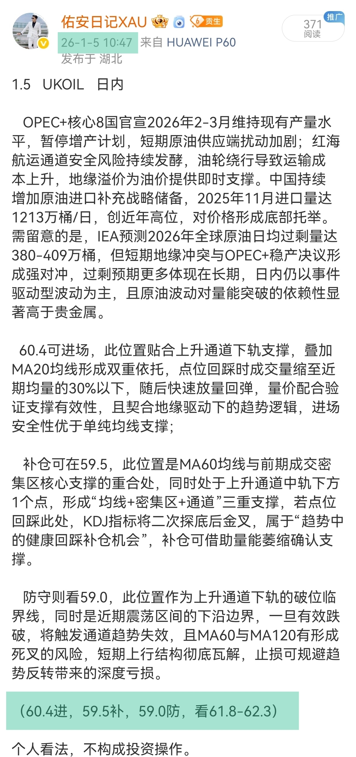 1.5UKOIL日内(后续)分析的深度,决定了楹荔的高度。市场从不会亏待用心解读