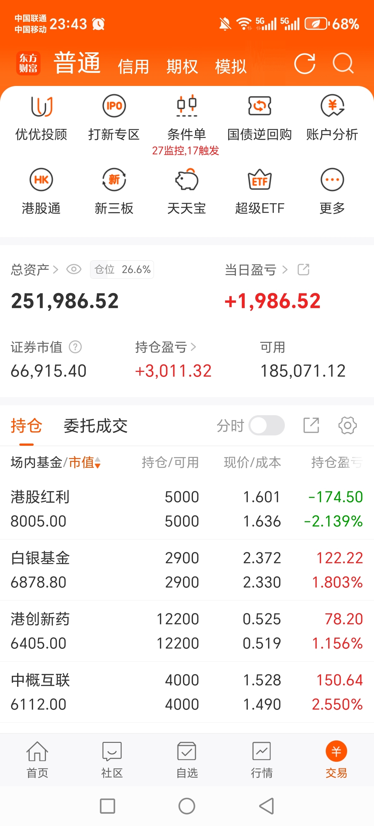 2026.1.5仓位26.6%,总体是一个卖卖卖的节奏,27个条件单成交了17个