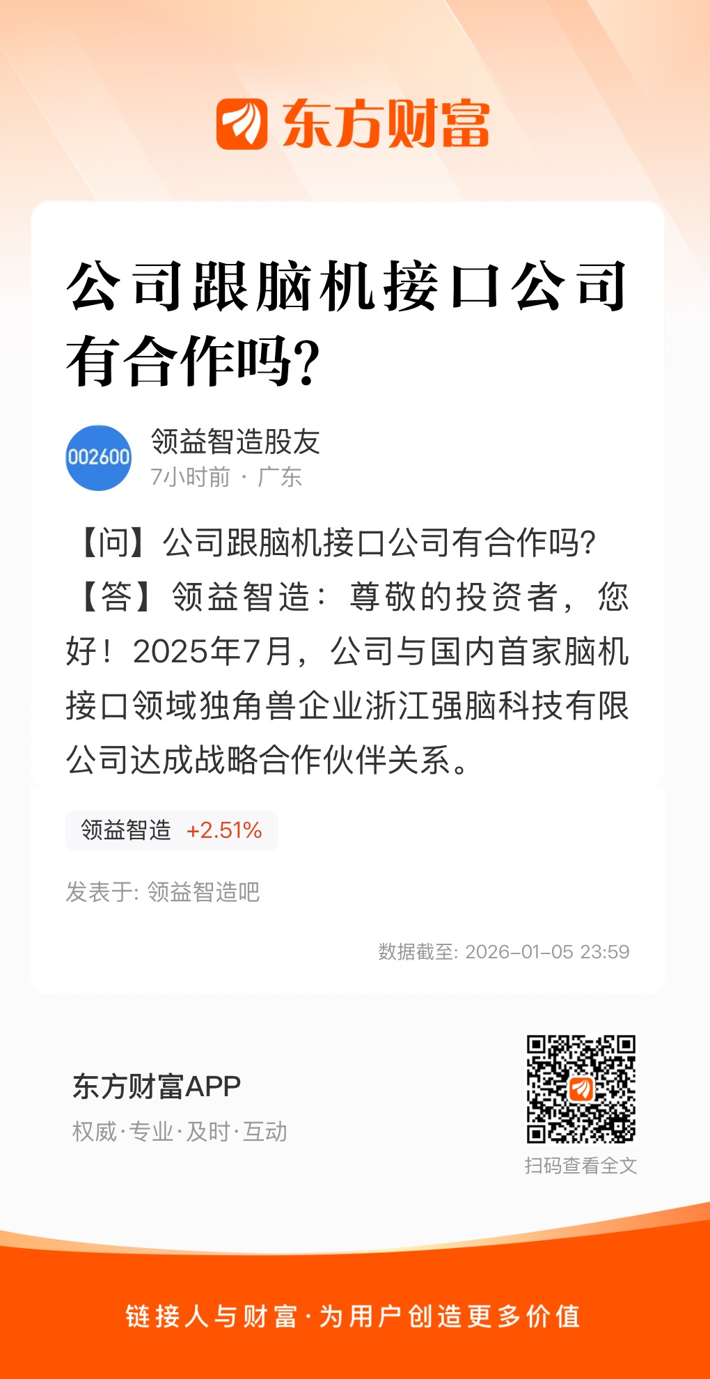 尊敬的投资者,您好!2025年7月,公司与国内首家脑机接口领域独角兽企业浙江强脑科技有限公司达成战略合作伙伴关系。