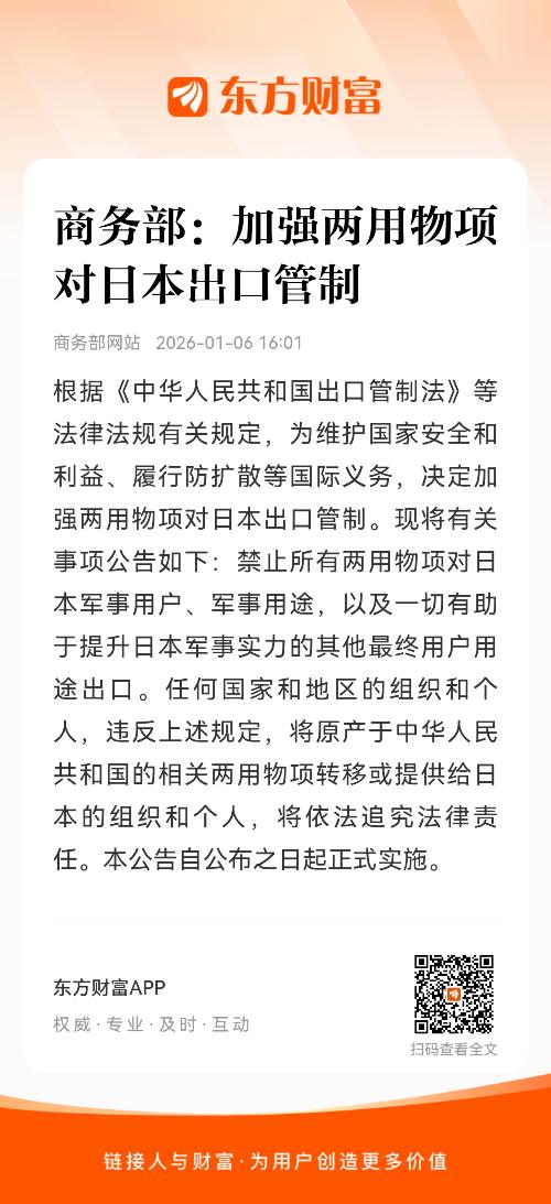 问:2026年1月6日,商务部宣布加强两用物项对日本出口管制,请问有何考虑?