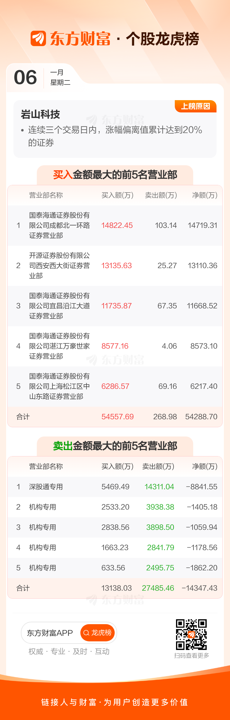 交易所2026年1月6日公布的交易公开信息显示,岩山科技因成为连续三个交易日内,涨幅偏离值累计达到20%的证券上榜。岩山科技当日收报8.58元,涨跌幅10.00%,换手率1.28%,成交额6.13亿。异常期间12月31日至1月6日,期间涨幅23.45%,累计偏离值20.34%,区间成交额34.03亿。