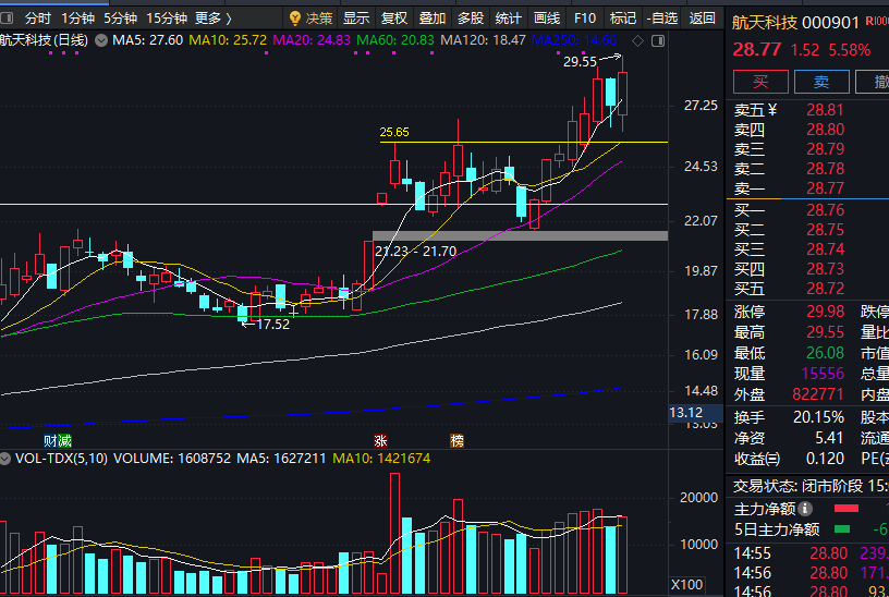 航天科技:国防军军+航天科技+无人驾驶+卫星导航。趋势还在,今天没有做T,继续持股。公司是中国航天科工旗下的重要上市公司,核心定位为航天技术应用产业平台。主营业务聚焦于汽车电子及航天应用产品,其“航天级”的技术标准与质量管理体系是其核心竞争力的重要组成部分。近期商业航天题材持续走强,公司同样是拥有商业航天与军工相关题材。且与市场高热度的蓝箭航天关系密切。