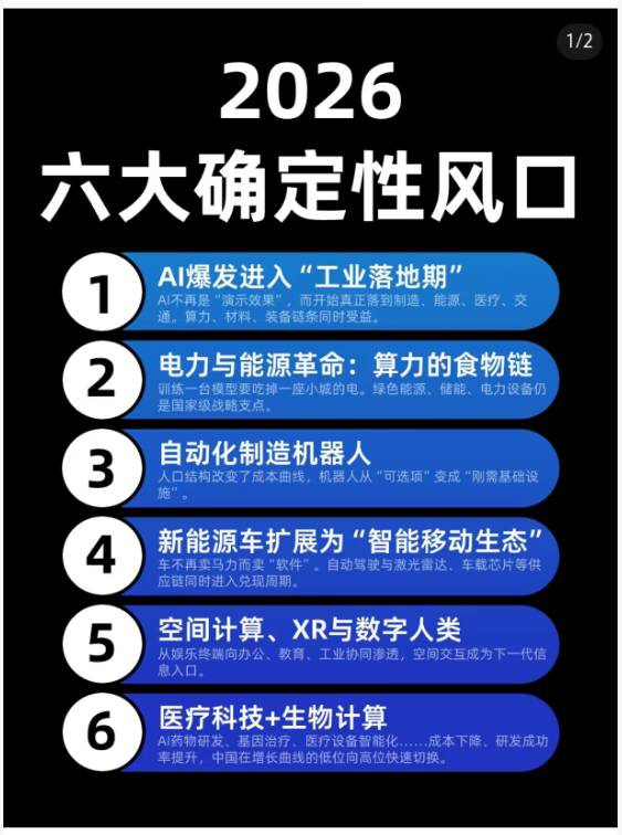 最近,看到有位博主列举了2026年6大确定性风口,分别为: