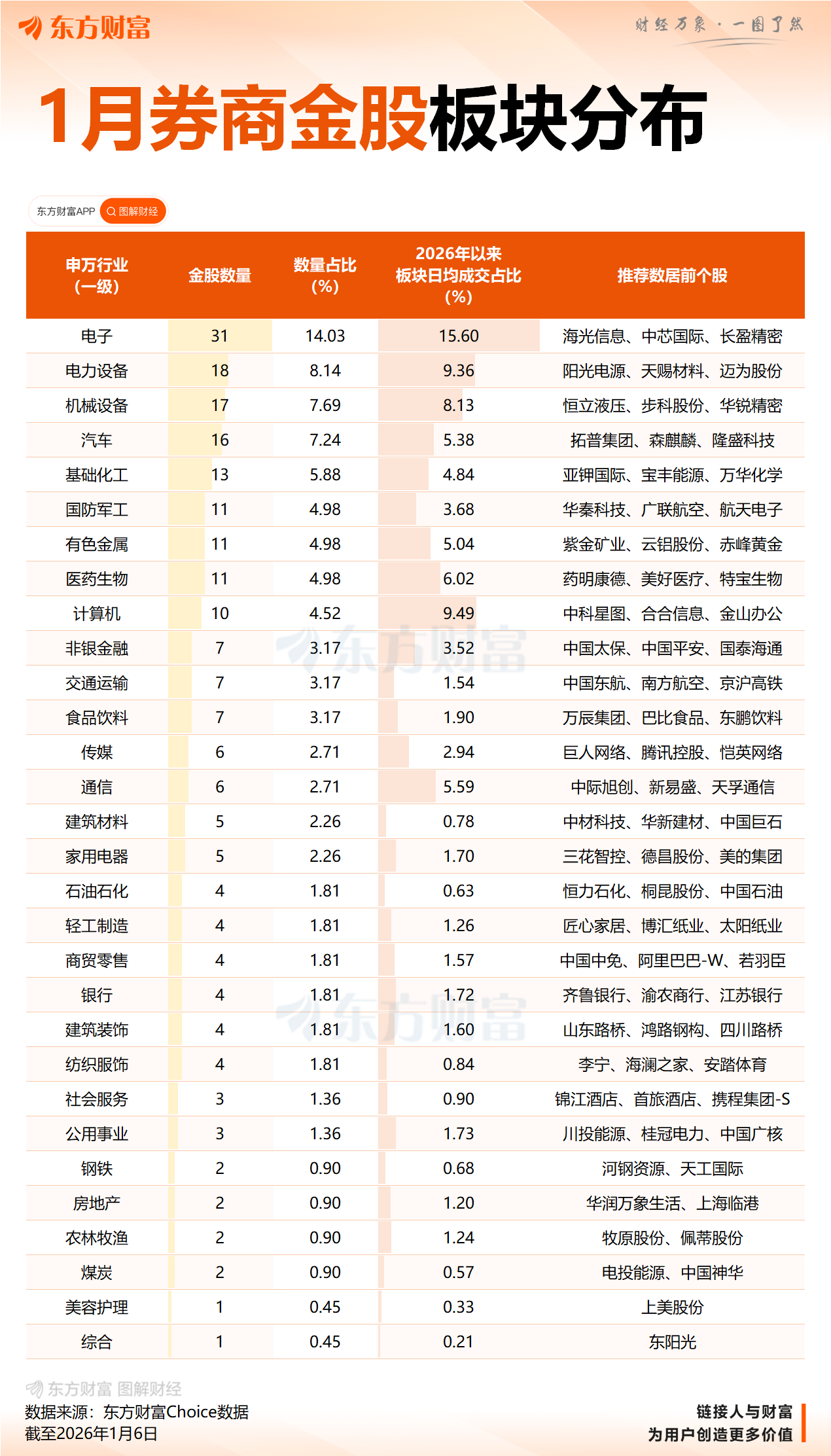 行业方面,国信证券研报指出,在对券商金股股票池进行去重后,从绝对占比来看,券商2026年1月金股在电子、有色金属、基础化工、机械、电力设备及新能源行业配置较高。