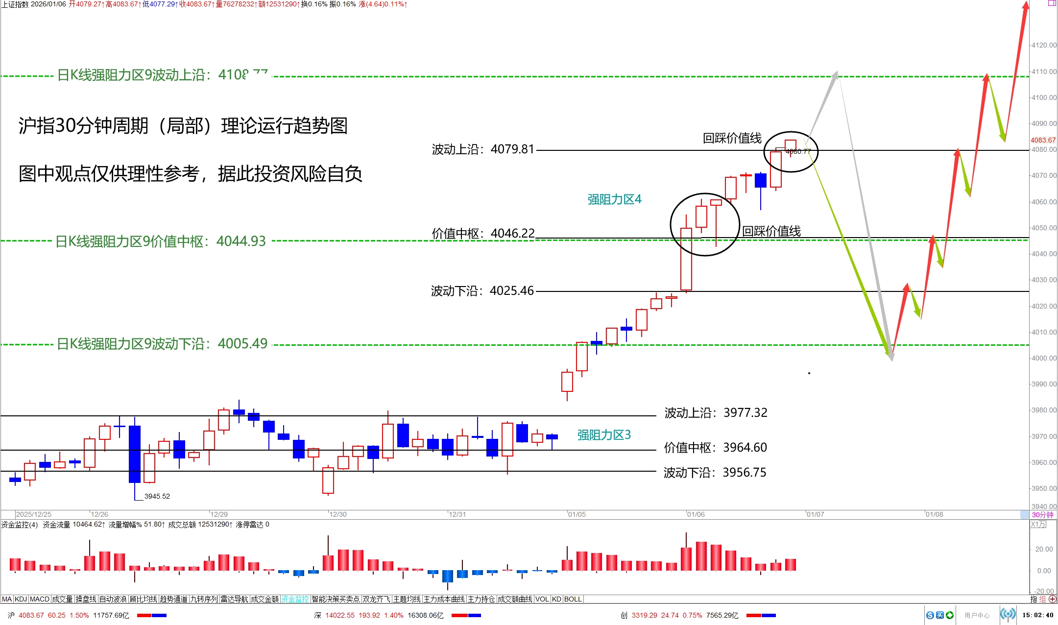 沪指目前正受到30分钟周期“强阻力区4”的目标区域“波动上沿”4079.81点价值线向下的“价值牵引”作用而呈现“冲高回落”态势!