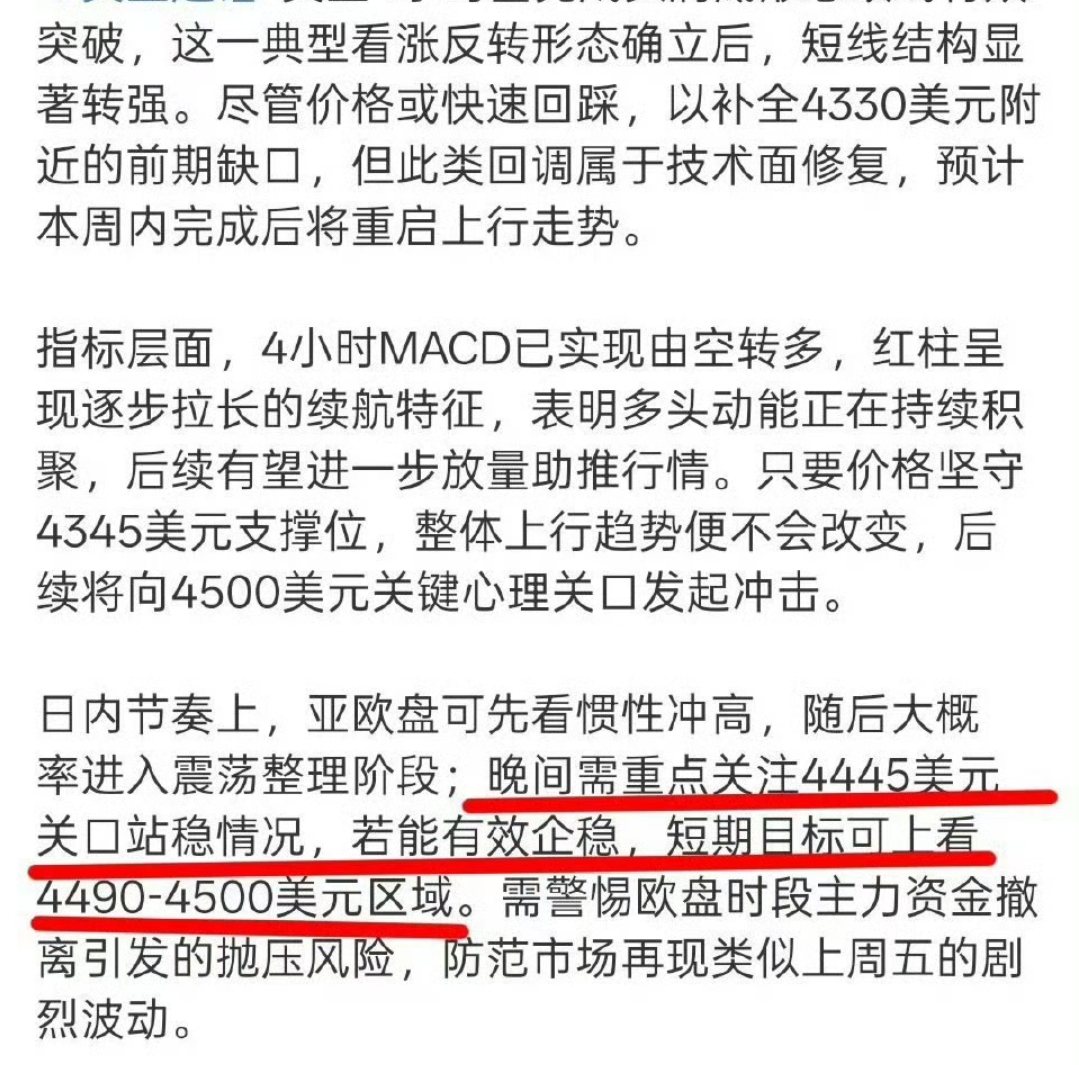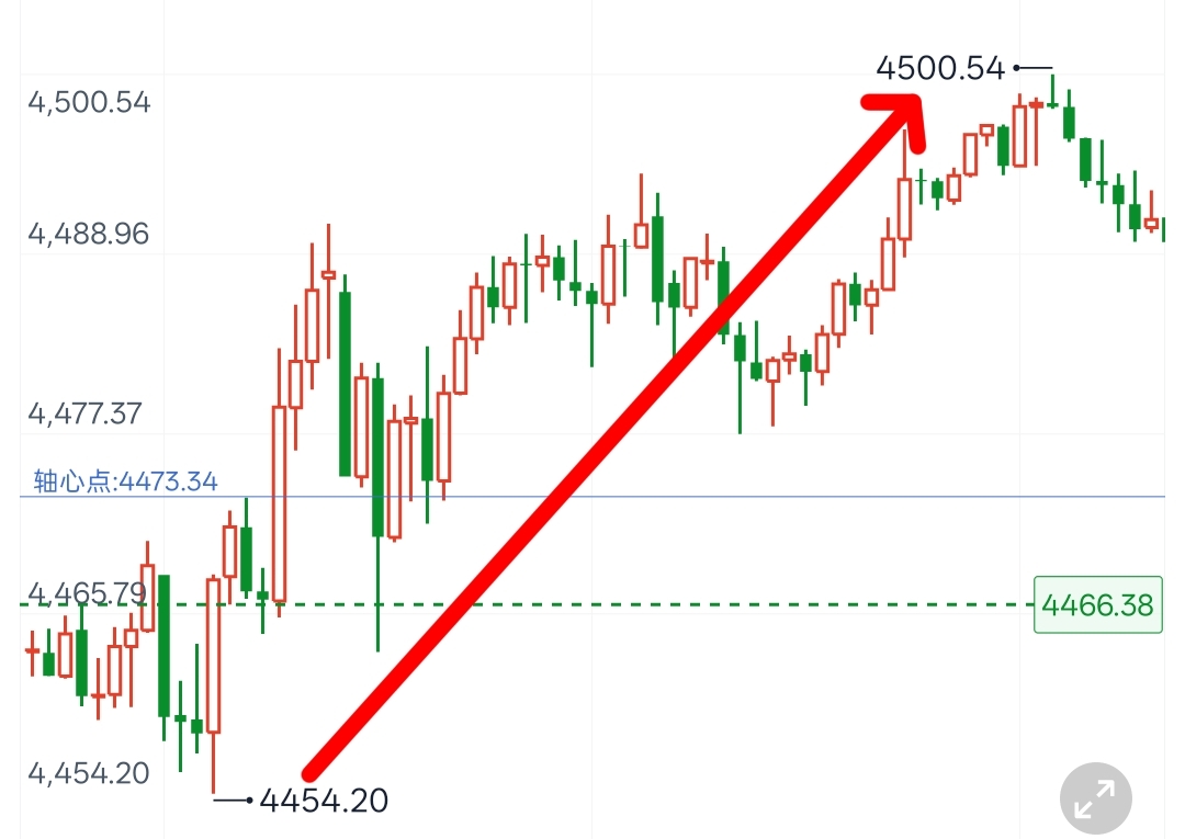 黄金4445支撑确认后,美盘多头发力冲高,行情走势完全契合预判,稳稳站上4500